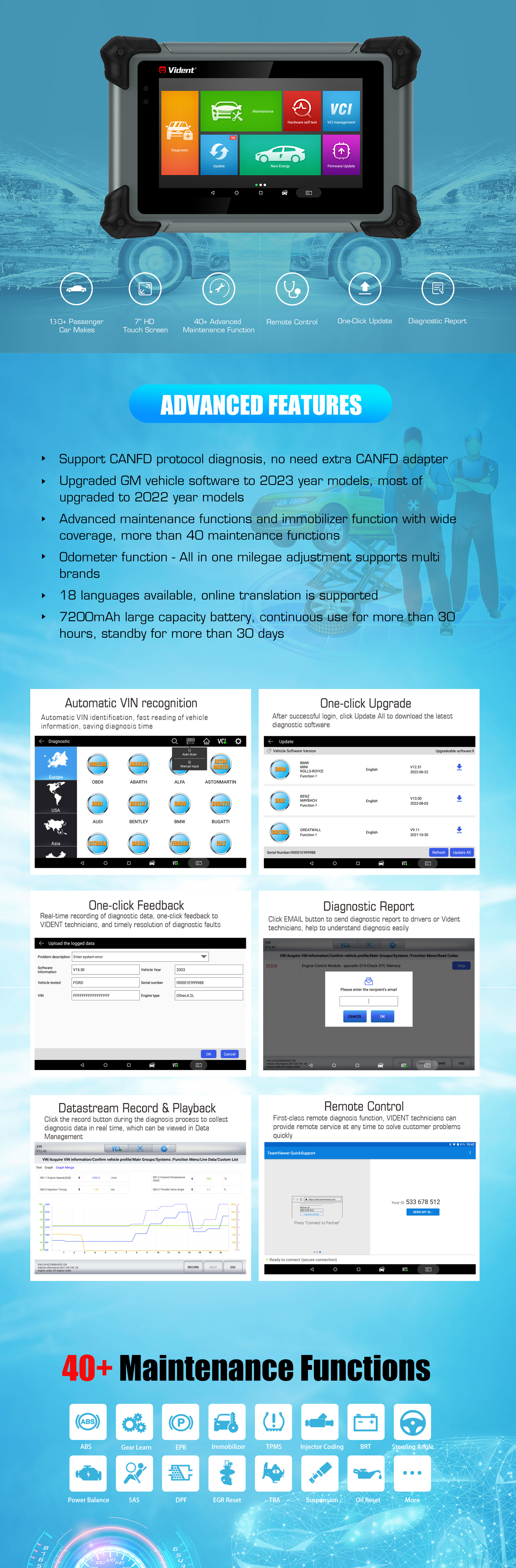 Autodiagnostický skener iSmart800 Pro je nově uvedený na trh automobilový diagnostický skener od společnosti Vident pro 12V osobní vozidla, který je kompatibilní s většinou značek vozidel na světovém trhu. Díky uživatelsky přívětivému rozhraní Android, 72GB pevnému disku, procesoru Cortex-A7 1,3 GHz a snadné navigaci, snadné komunikaci s automobily a 7" dotykové obrazovce HD 1024x600 IPS LCD podporuje iSmart800 Pro diagnostiku všech systémů ECU pro více než 110 značek automobilů a také více než 40 běžně používaných servisních funkcí, které usnadňují a zefektivňují práci mechaniků. Naším cílem je poskytovat cenově dostupné diagnostické nástroje pro autoservisní mechaniky po celém světě a spolehlivá zařízení pro snadnou práci!