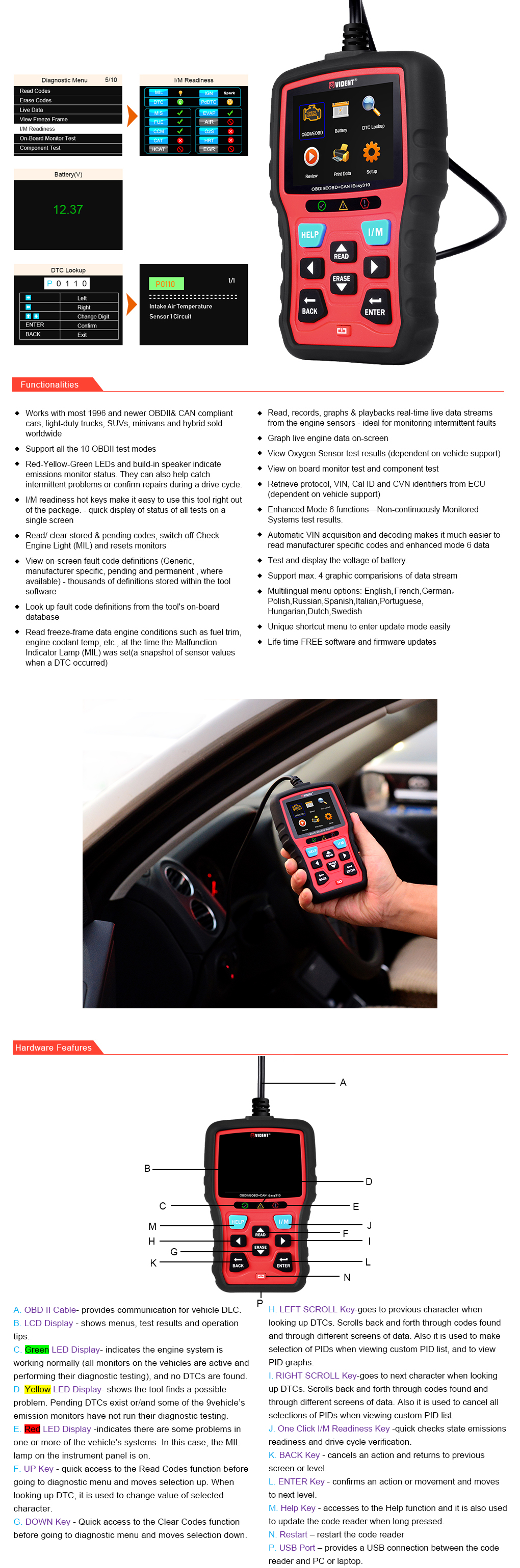 With impressive design in physical tool and menus of software, newly issued iEasy310 is the best seller among iEasy series OBDII/EOBD+CAN Code Reader. Supporting all OBDII 10 test modes,battery display, graphic comparisons, iEasy310 is surely a must-have tool for each car owner to shoot all OBDII DTCs.