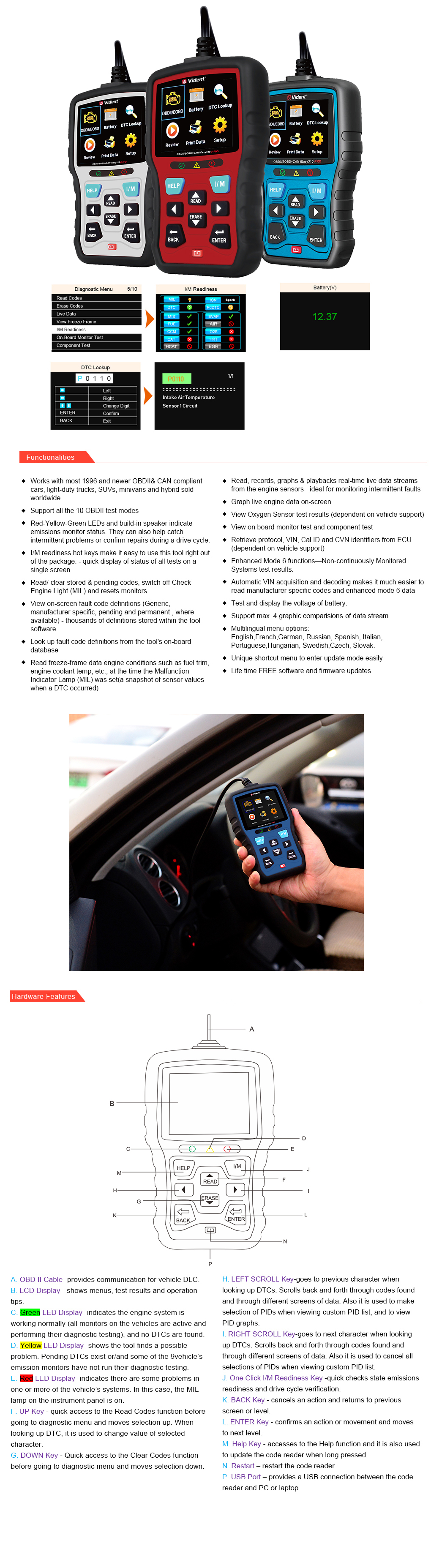 iEasy310Pro OBDII/EOBD+CAN Fault Code Reader is new memember of Vident iEasy series family. In contrast with iEasy310, it offers lovely colors for choice. Same as iEasy310, it can automatically indentify vehicle VIN code, support max. 4 graphic comparsions of live streams, offer advice of repair and triger alarm when live data is beyond normal range.