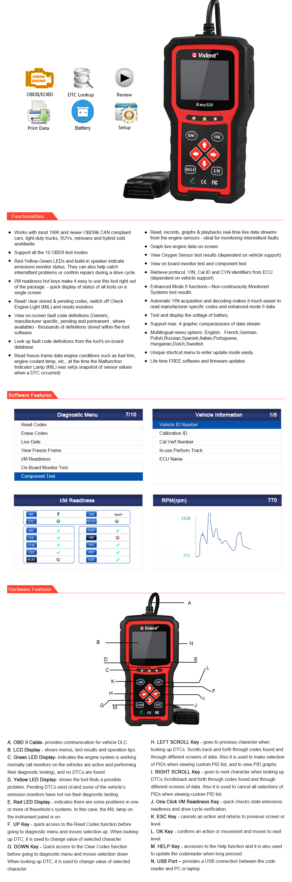 The iEasy320 CAN OBDII/EOBD Code Reader is a ruggedised designed and untra-portable code reader for entry-level pro and savvy DIYer. With the capabilites of iEasy300 Pro, plus oxygen monitor test, on-board monitor test, and component test, iEasy320 is truly the ultimate in power and affordability, In addition, thousands of troubleshooter code tips help technicians to save diagnosis and repair time.