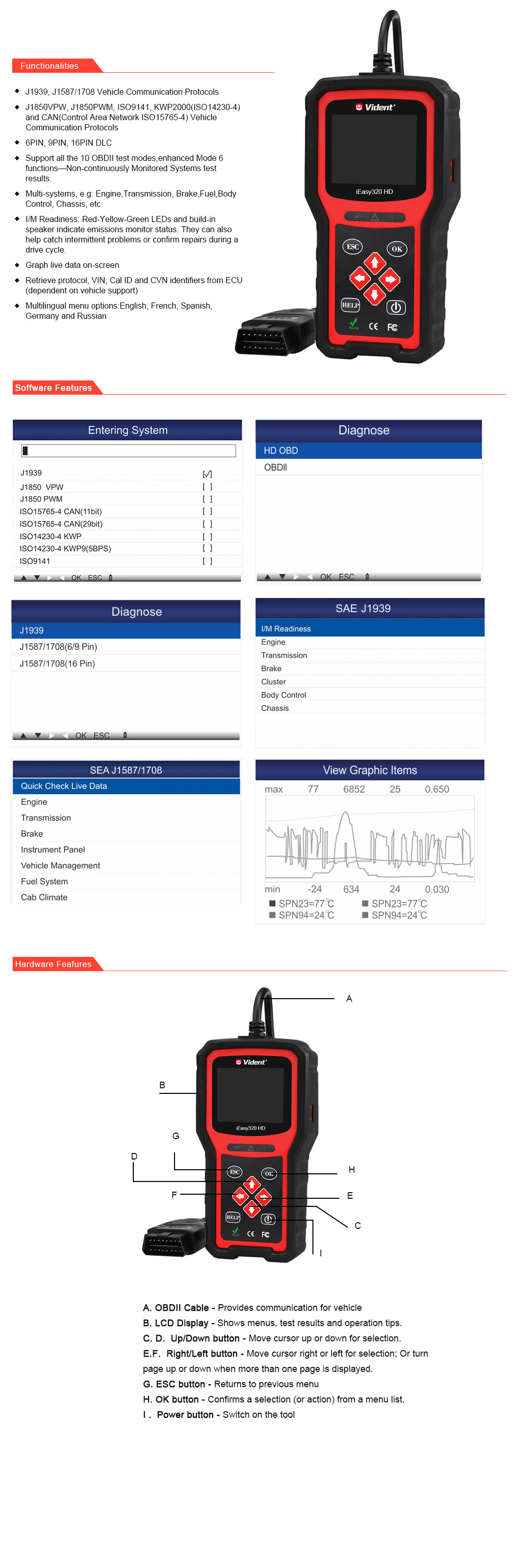 iEasy320HD is specially developed for heavy-duty vehicles(Diesel) and passenger cars(Gasoline or Petrol), which enables users to read DTCs, clear DTCs and view the datastream with a live color graphing. It covers a wide range of vehicles since it offers multiple data bus protocols, such as J1587, J1939, J1850VPW, J1850PWM, ISO9141, KWP2000(ISO14230-4) and CAN(Control Area Network ISO15765-4).