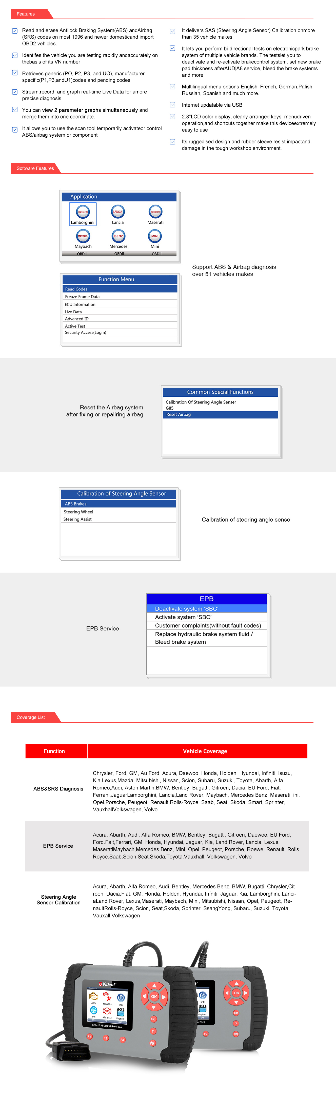This new ABS&SRS Reset Tool iLink410 is built to help the diagnosis of ABS and airbag faults and determine why the ABS&SRS warning light is on. Featured with ABS and SRS system diagnosis,ABS and SRS bi-directional tests, ABS bleeding, SRS reset , steering angle sensor calibration,Electronic parking brake reset functionalities and wide vehicle coverage,i410 is the perfect tool that professional mechanics can’t wait to have.