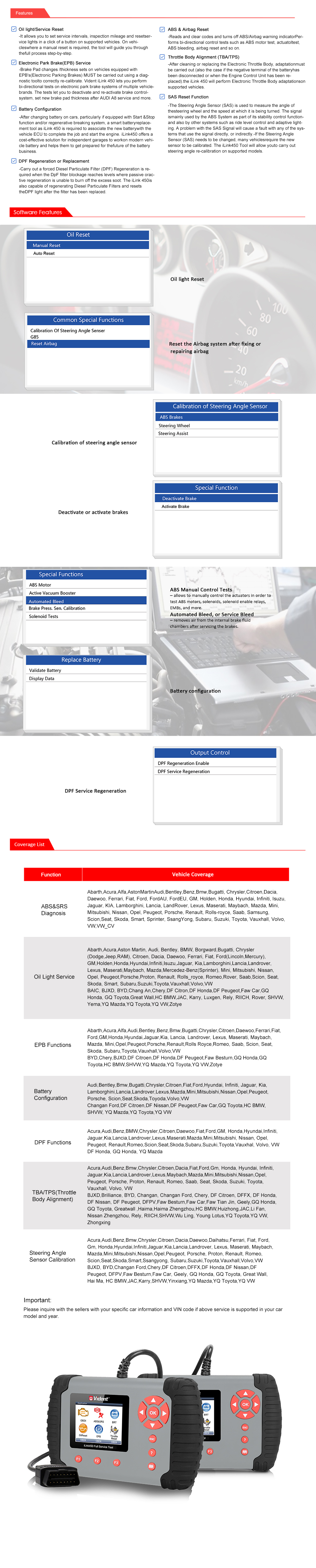 iLink450 Full Service Tool is specially designed for professional technicians and body shops to service individual specialized systems. The functions include EPB, Oil Service, ABS&SRS reset, Battery Configuration, Steering Angle Sensor Calibration, DPF regeneration and Throttle body alignment .