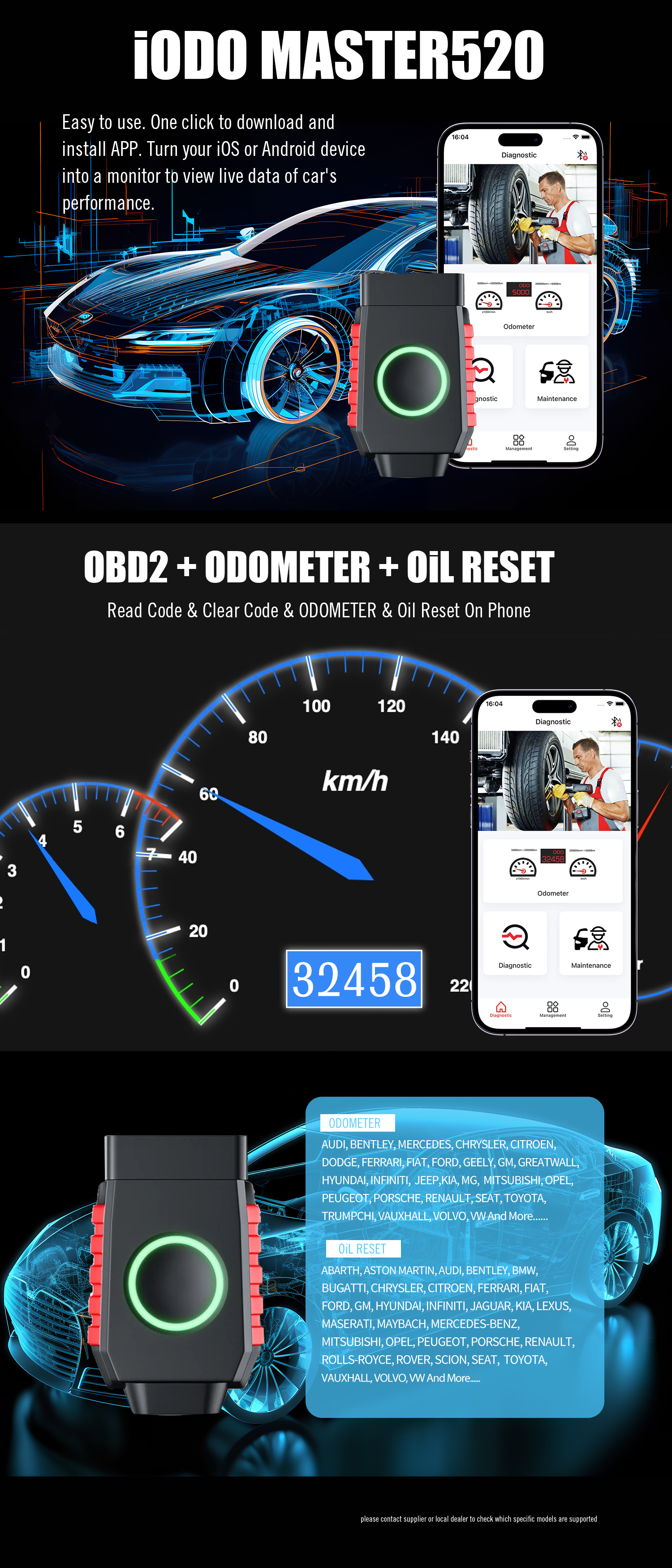 iODO Master520 is designed for passenger carmileage calibration and oil reset, which has wide coverage for global car brands. As a newly released bluetooth diagnostic dongle, supports iOS and Android operating system mobile devices.The iODO Master520 is particularly helpful for used car store and DIYers who wants to do service reset himself.