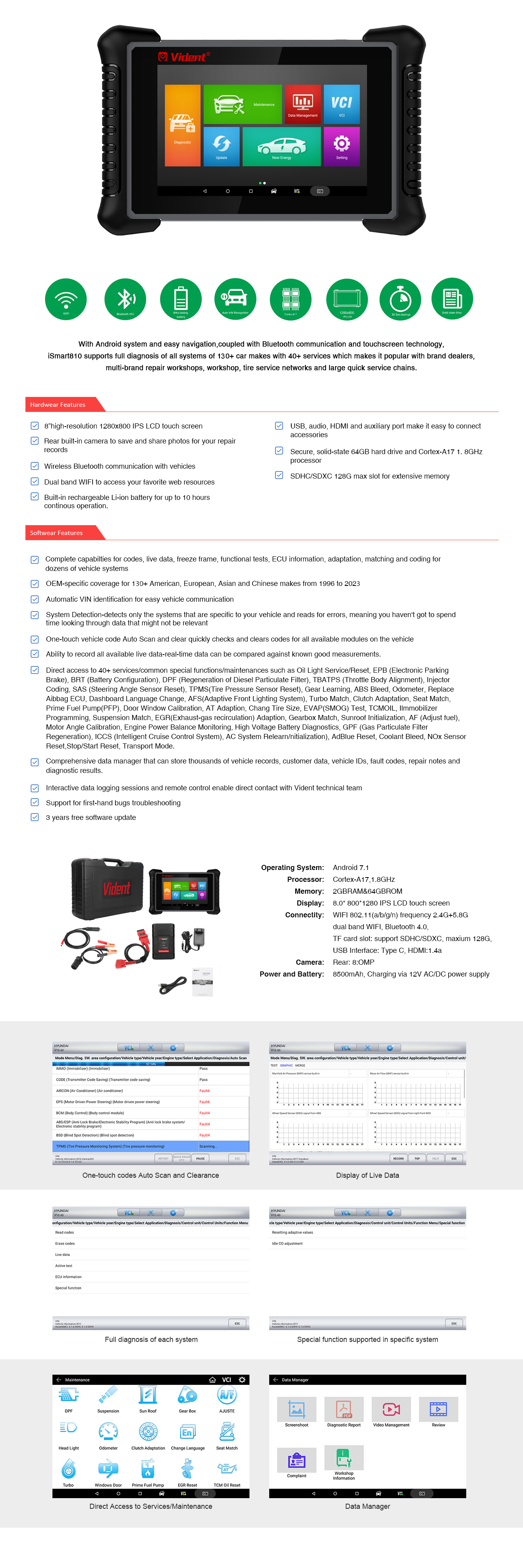 With user-friendly Android interface, solid-state 64GB hard drive, Cortex-A7 1.8GHz processor and easy navigation, coupled with Bluetooth communication, 8”high-resolution 1280x800 IPS LCD touch screen technology, iSmart810 supports full diagnosis of all systems of 100+ car makes with 40+ services which makes it popular with brand dealers, multi-brand repair workshops, workshop, tire service networks and large quick service chains.