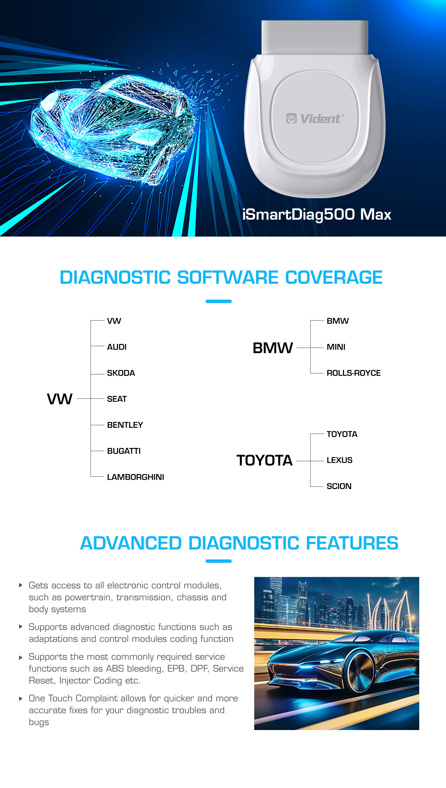 The iSmartDiag500Max support selections of VW, BMW & TOYOTA groups vehicle brand, which offers OE level diagnosis for all electronic control systems.It's not only covers basic diagnostic functions like read/erase fault code, live data, active test, but also capable with advanced functions like off-line coding and adaptations. In addition, it provides some commonly required service functions, such as Oil Light Reset, Injector Coding, Electronic Parking Brake Service, Battery Configuration, Steering Angel Sensor Calibration, DPF etc.